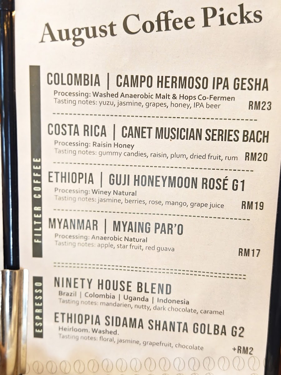 At Ninety Guest House & Coffee Bar, located in the heart of Ipoh, culinary enthusiasts will find a delightful blend of comforting café vibes and enticing flavors. The menu features an array of expertly crafted beverages, with a highlight being their exceptional filter coffee — the Ethiopian Guji Honeymoon Rose G1, praised for its winey notes. Beyond drinks, the café excels in its delectable desserts; the truffle cheesecake is a standout, delivering rich, balanced flavors and a luxuriously smooth texture that leaves a lasting impression.